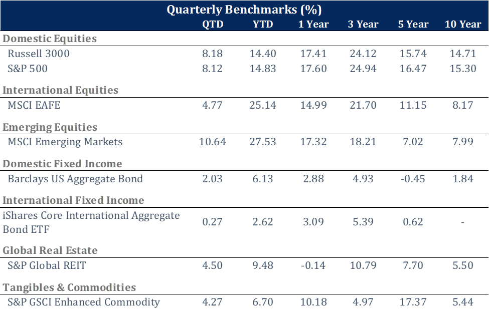 As is typically the case, investors today are confronted with a mix of positive and negative economic and investment signals. This is not any different from years past. The road to investment growth is rarely wiped clean of at least some potholes and cracks. Despite this uncertainty, both stocks and bonds are up, and investors with balanced portfolios are now enjoying their third consecutive year of positive returns across all major asset classes. This performance underscores a key principle: markets reward those who stay the course through uncertainty. This perseverance does not require blind optimism but rather thoughtful preparation. To that end, we will continue to manage your portfolio to perform across a range of market conditions and position you to both capture opportunities all while managing risk.